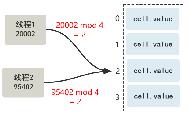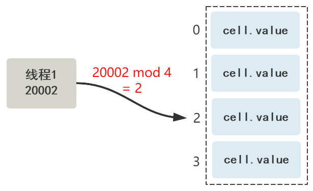 我们在每个线程中维护一个局部变量,这个变量属于线程,这个变量的值根据 cell[] 数组的大小哈希取模,就可以映射到其中一个 cell 上了。