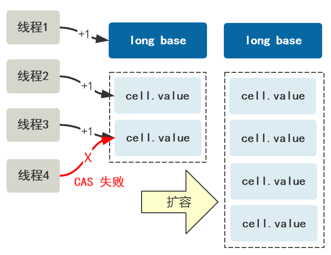 - 如果此时又冲突,并且 CAS + 1 失败,那么 cell[] 数组扩容。