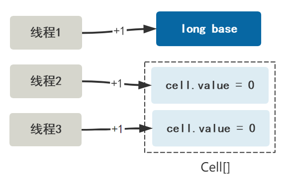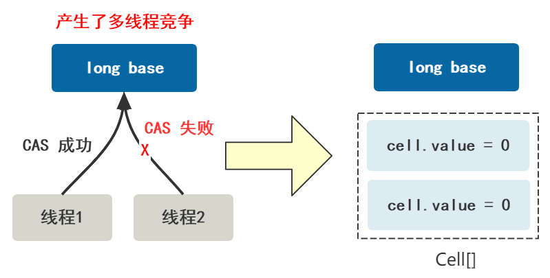 我们把一开始使用的唯一共享变量叫做 base,把之后开启的多个变量叫做 cell 类,放在一个 cell[] 数组里。cell 类只有一个变量 value,存储累加过程中的值。
