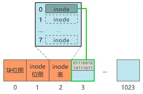 同样,和位块图管理块的使用情况一样,我们也需要一个 inode位图,来管理 inode 的使用情况。我们就把 inode 位图,放在 1 号块吧!