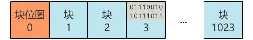 我们给块 0 起个名字,叫块位图,之后这个块 0 就专门用来记录所有块的使用情况,不再用来存具体文件了。
