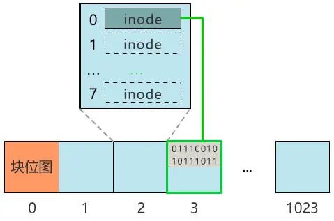 当我们再存入一个新文件时,只需要在块位图中找到第一个为 0 的位,就可以找到第一个还未被使用的块,将文件存入。