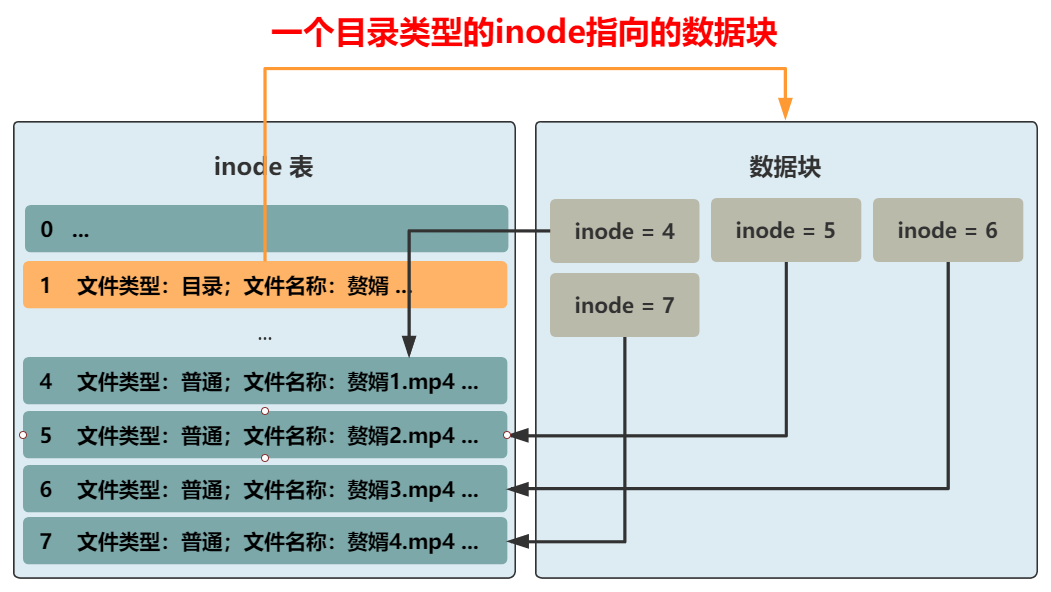 如果是目录文件,则这个 inode 所指向的数据块,就是一个一个指向不同 inode 的紧挨着的结构体。